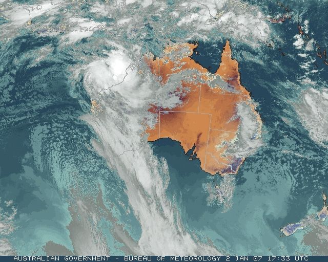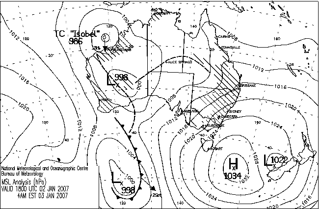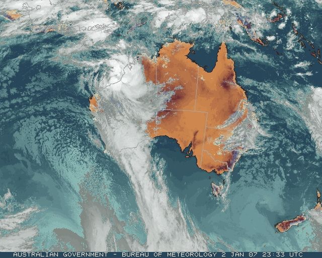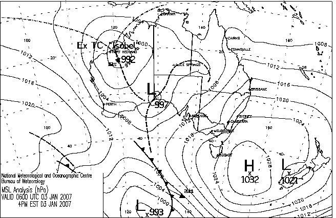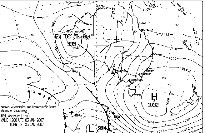 WA: TC Isobel crosses WA north coast. Tropical Cyclone Isobel crossed the northern WA coast near Pardoo, about 100km ENE of Port Hedland, soon after midday. The system continued to be a weak one, its central pressure on landfall estimated at 990hPa. It had the distinction of being multi-centred, which helped to keep it weak, but resulted in significant rain falling over a wider area. Cyclone warnings estimated winds near the cyclone would reach 100km/h; the highest recorded wind gust was 72km/h and sustained wind speed 63km/h at Barrow Island, well to the west of Isobel's track. Heavy rain preceded the cyclone during the day (see downpours) with by far the highest total 141mm between 9am and 3pm at Mandora, just east of Isobel's landfall. The cyclone weakened into a low pressure system almost immediately upon landfall, but its massive moisture and instability began interacting with a southern trough and unseasonably cold air advancing from the west as it moved into the Great Sandy Desert (see stories below and on 4 Jan 2007).