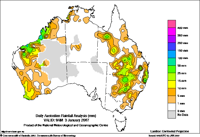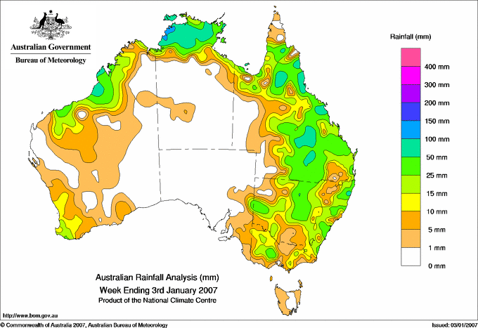 WA: Also a year of extremes. While average rainfall across WA during 2007 was the eighth highest since 1900, this masked extremes from north to south. In much of the north it was an exceptionally wet year, while the west coast and South West experienced well below average rain with parts of the coastal fringe, including Perth, having their driest year on record. Full reports for the state and Perth.