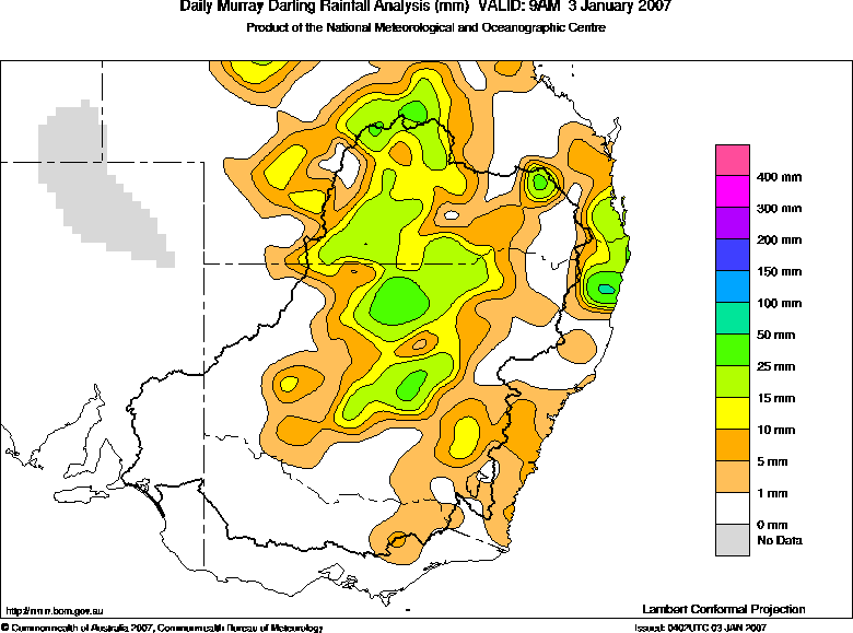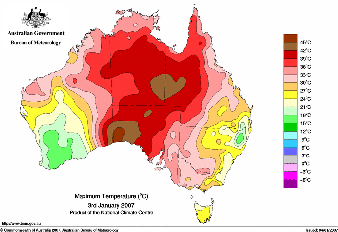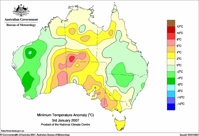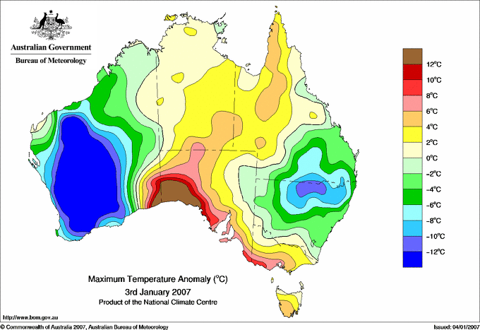 AUS: Bureau's annual climate statement shows 2007 a year of contrasts. The Bureau of Meteorology's Annual Climate Statement, released today, shows Australia's annual mean temperature for 2006 was the eleventh warmest year since 1910 while the global mean temperature is expected to be the sixth warmest since 1861. Average maximum temperatures have been the highest on record since 1950 in Victoria, South Australia, Western Australia and in the Murray-Darling Basin. Rainfall was well below normal in the southeast and far southwest, but close to normal when averaged over the whole country. Full report.