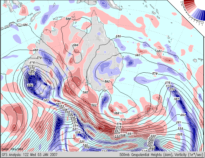 The upper air situation at 500hPa at the same time shows the deep upper low cutting off from its parent Southern Ocean trough and covering the southwestern third of the state. The upper low further enhanced uplift across the region, thickening cloud and bringing rain and record cold temperatures underneath it -- compare this chart to the satellite images, and the solar radiation and maximum temperature anomaly charts in The Day in Charts section below. COLA |
