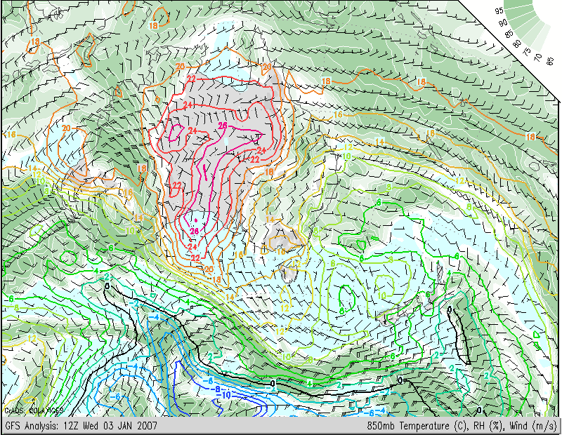 | Some idea of the intensity of the WA cold airmass is given by the temperature readings at 850hPa (about 1.4km above sea level, and well away from surface heating effects) at 8pm WDT which indicated 28C at the Head of the Bight, but only 4C along the WA South West coast. Note the moisture streaming down through the eastern half of the state before curving around the base of the trough and returning northwards across SW WA, much envigorated by the colder air. |