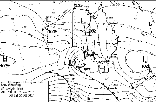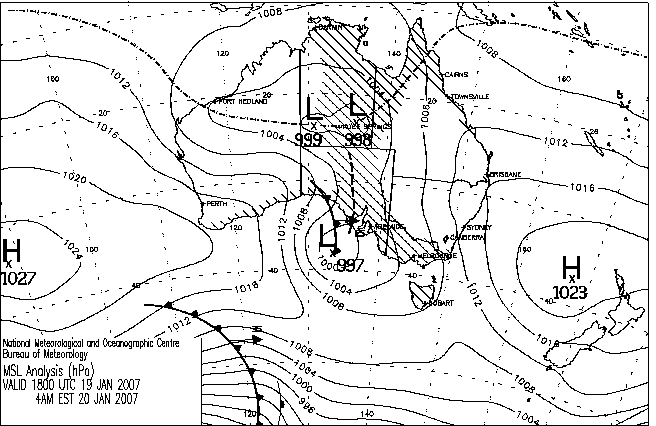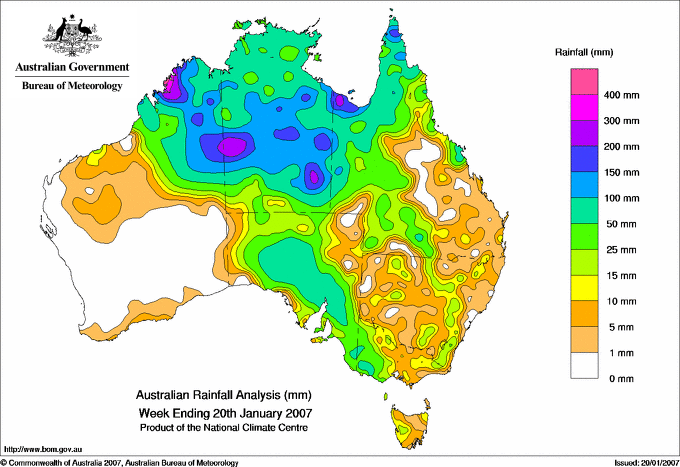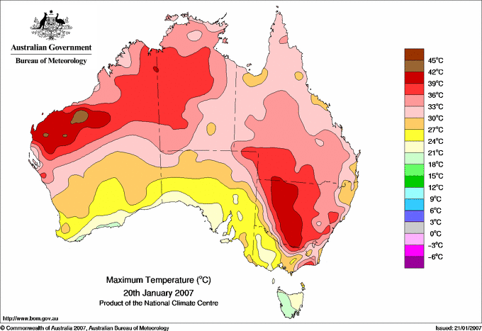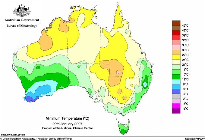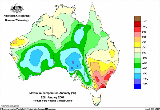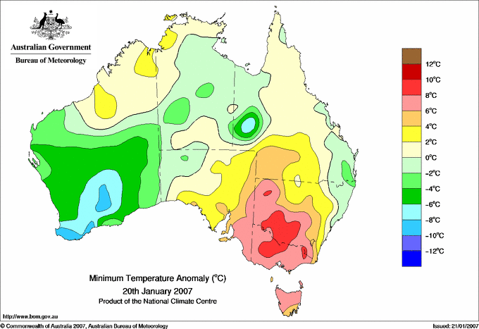 WA: Cool in the south. A clear, calm night following yesterday's cool southerlies resulted in record low January minima in the state's South West and Great Southern. Pemberton and Katanning, both with half a century of observations, reported their coldest January night with lows of 4.0 and 5.4 respectively. Both minima and maxima today were 6 to 9C below average across large parts of southern WA.