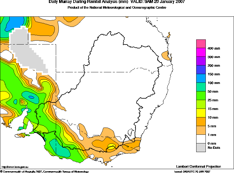 As the rainfall chart shows, a broad band through SA and western VIC received from 25 to over 100mm in the 24 hours to 9am as the uplift area passed. Heavy falls over 100mm fell in SE NT close to the monsoon low. For many locations in this broad area, these were the heaviest one-day rain totals in years, while a few locations received spectacular falls. Hawker, Georgetown, Mt Bryan, Port Pirie, Corny Point, Wolseley and Frances in SA and Coleraine in western VIC all had their heaviest January rain in over a century of records. Parawa in the southern Mt Lofty Range and Casterton in western VIC had their all-time heaviest falls in over 50 years. For the bulk of stations with shorter histories, their previous records were broken by substantial margins. See records for full details, which will be updated as the returns come in from postal-reporting stations over the next month or two. Wettest shows all totals of 50mm or more. Downpours provides details of some of the remarkable short-duration deluges, many from thunderstorms embedded in the rainband leading to flash flooding. Some of the more notable officially recorded cloudbursts in today's list include: