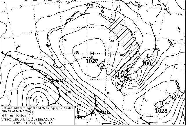 The easternmost East Coast Low on the surface charts below bullied Lord Howe Island overnight, giving the airport anemometer a workout that saw a new record daily wind run for June. 1398km of air passed the anemometer cups in the 24 hours to 9am, an average speed of 58.3km/h. 57mm was recorded in the raingauge between midnight and 9am as the low approached the island then headed for the NSW South Coast. |