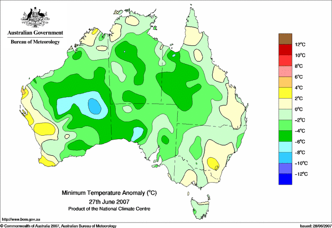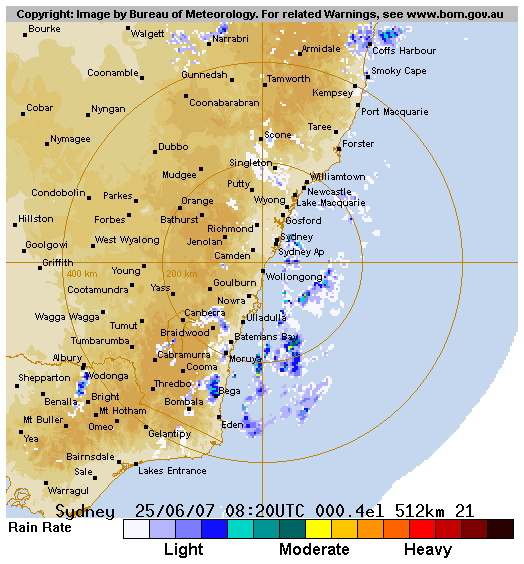 - Blue Mountains: Light snow showers were reported mid afternoon in the upper Blue Mountains at Mt Victoria, Blackheath, Medlow Bath and Katoomba, but did not settle. About an hour's heavier snow at Mt Victoria, from 4 to 5pm, also did not settle. At 9.30pm, snow was reported settling at Clarence, about 5km east of Lithgow.