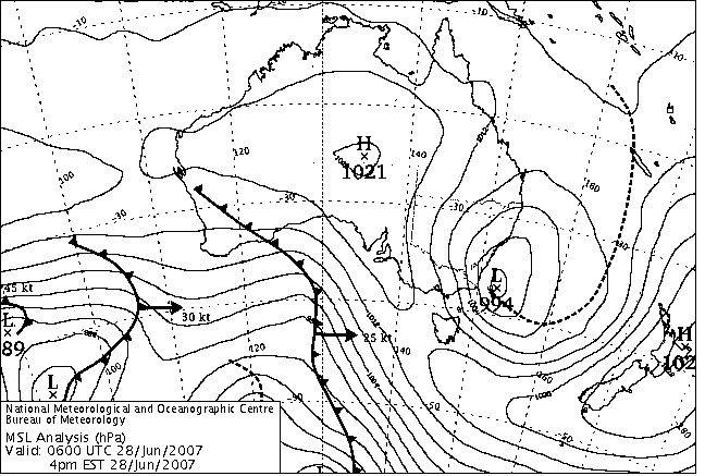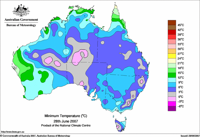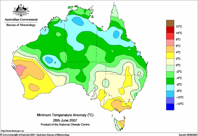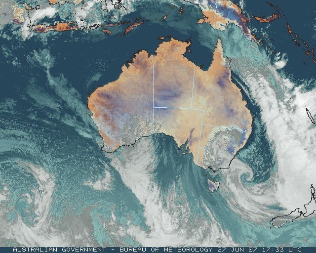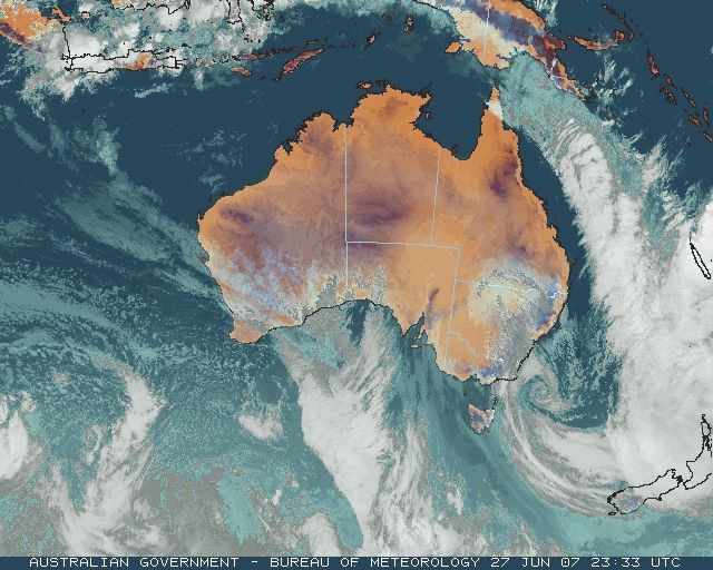 Temperature records high and low fell on either side of the continent today. Kalbarri and Denham on the WA central coast set record high minima in warm northwesterlies ahead of the front that brought heavy rain farther south. In QLD, cold air surging up from NSW set record low maxima on the Darling Downs and on the coast near Brisbane. Gladstone also recorded its coldest June night in 13 years. Details in records.