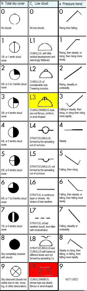 Print | Close | Weather symbols | Cloud and pressure trend symbols | Wind speed and direction symbols